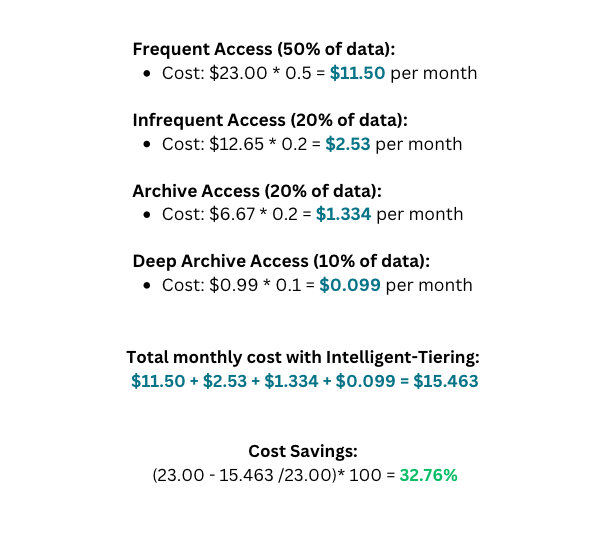 If 20% of your data transitions to the Infrequent Access tier after 30 days, 20% moves to Archive Access after 90 days, and 10% moves to Deep Archive Access after 180 days, your costs might look like this: