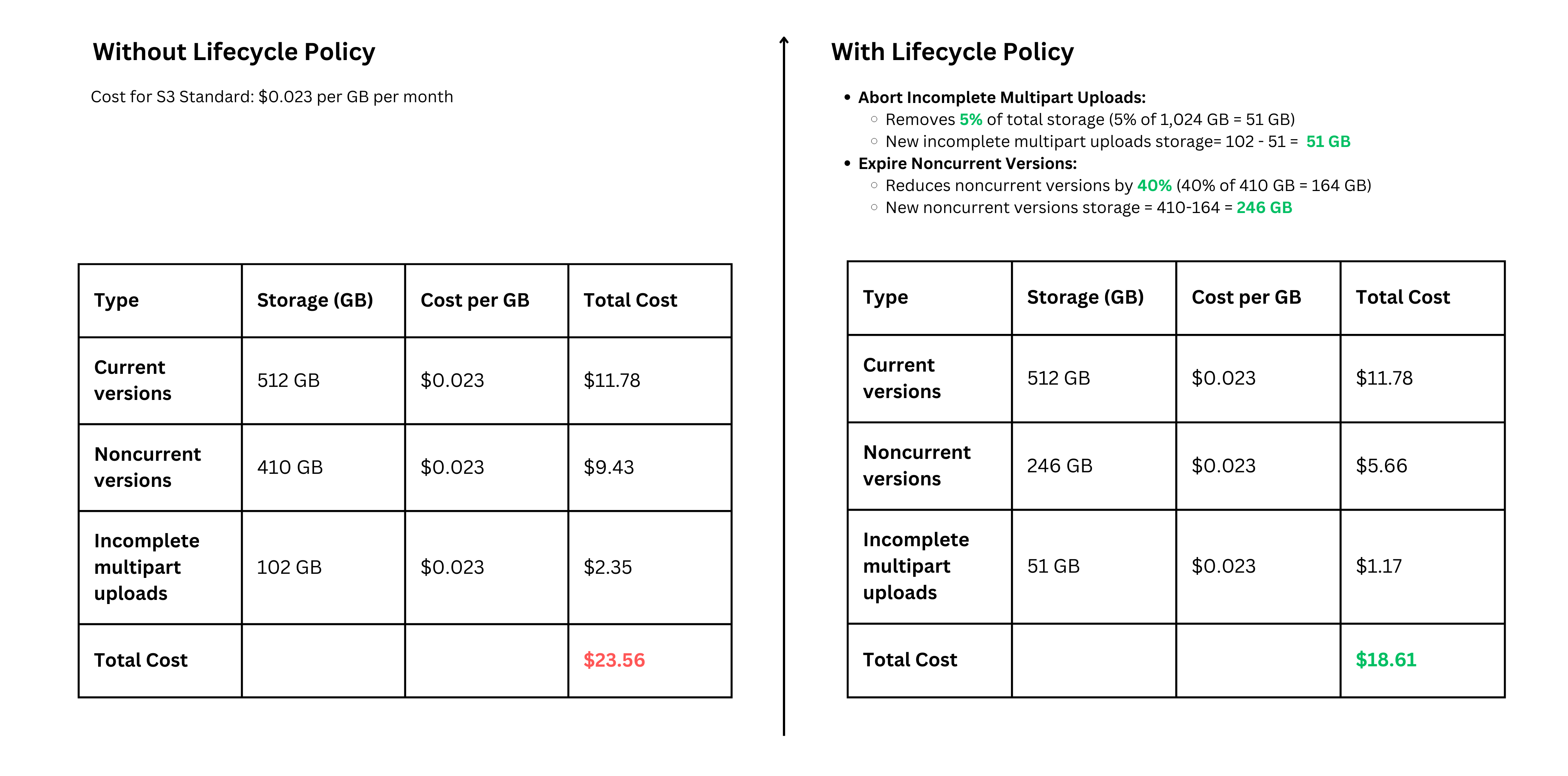 - Cost Impact: Deleting 40% of noncurrent versions reduces the total storage used by these versions.