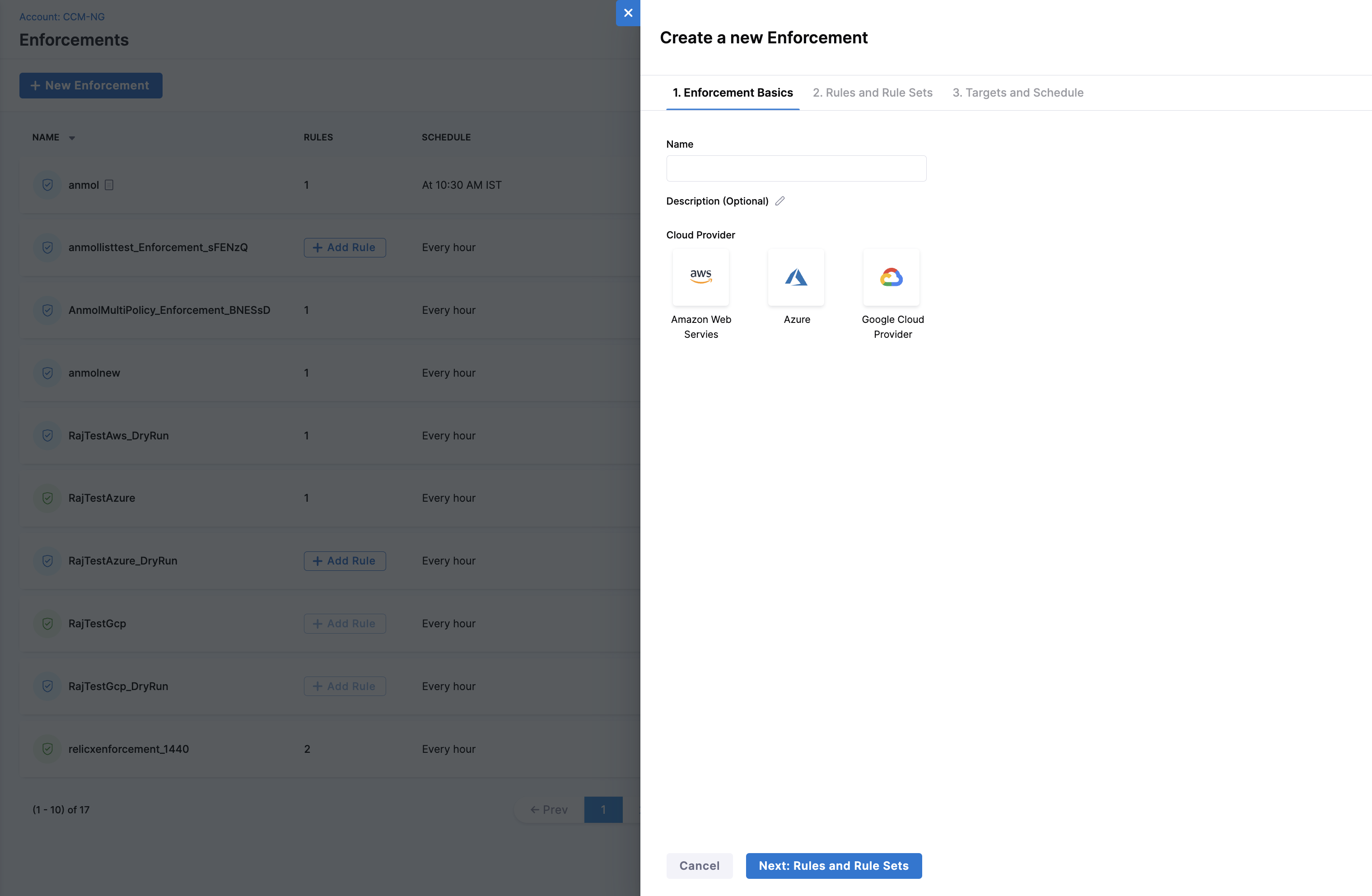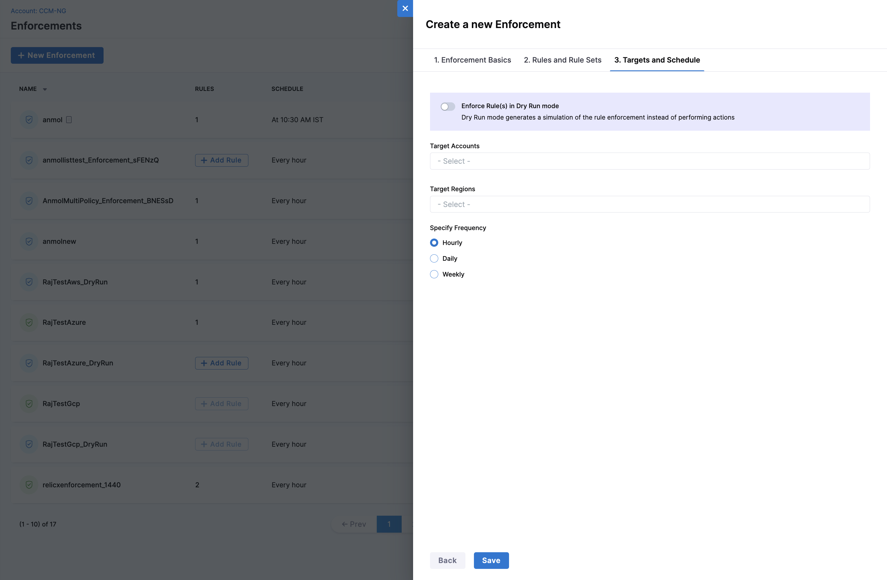 Enforcements enable you to enforce a certain set of Rules or Rule Sets (also known as governance guardrails) against a specific set of targets (accounts, projects, or subscriptions) to run periodically. Sometimes, we need rules to run periodically, such as every day, week, or month. However, running these rules manually every day or week at a specified time creates extra overhead and is a slow process prone to manual errors. To solve this, Enforcements allow users to set up a timely schedule and choose the day, time, and frequency for their rules or rule sets.