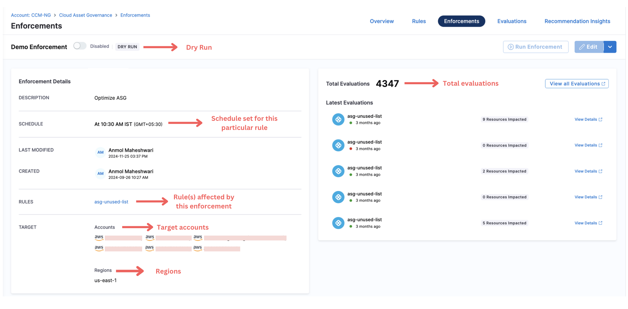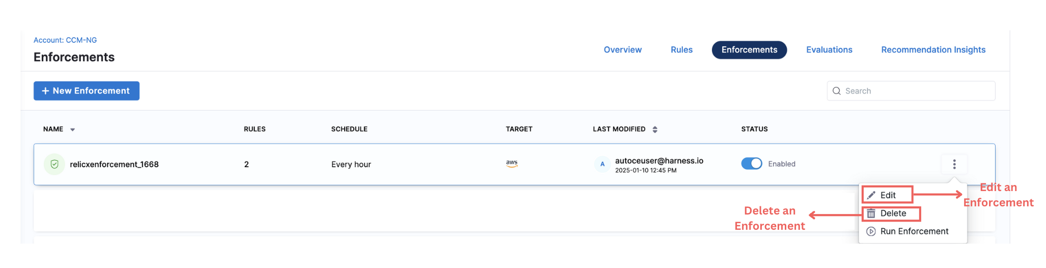 You can view any Enforcements on Rule Enforcements page. Click on the enforcement to view details such as the rules, target accounts, and regions included in the enforcement. For updating, you can use the "Edit" button from the vertical ellipsis menu (⋮) to update the enforcements as per your convenience.