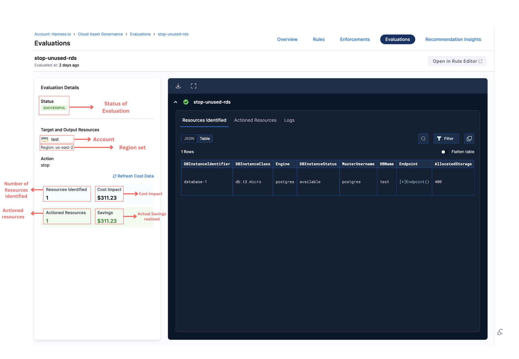 Evaluations include all the data about enforcements run (both RUN ONCE from rule editor and from Enforcement). The Evaluations window also shows you the total cost impact with each Enforcement i.e. the costs or spendings associated with each Evaluation along with the last time that Rule/Rule set was enforced. With Evaluations, you can view and audit all the Enforcements that ran in the past.