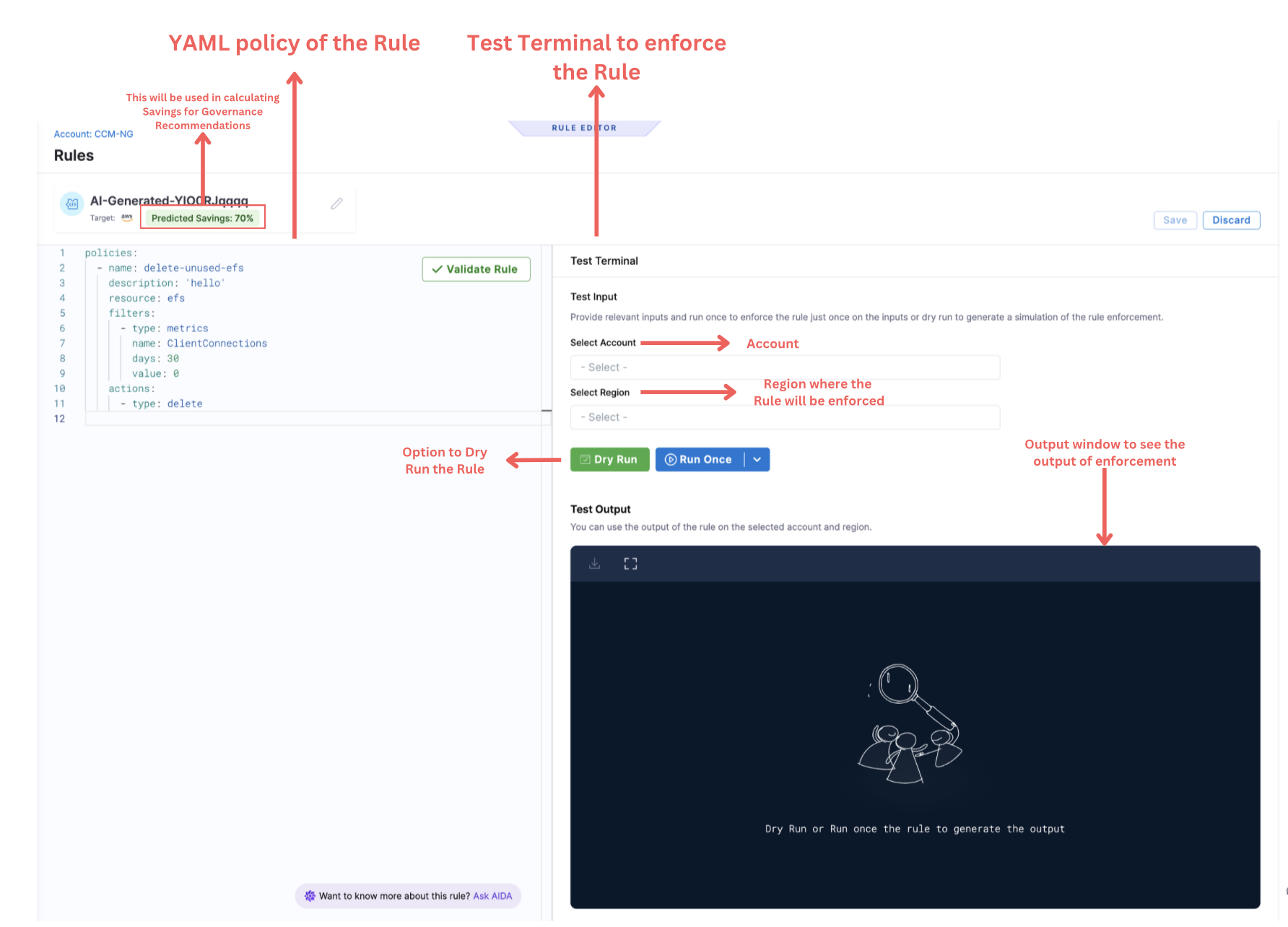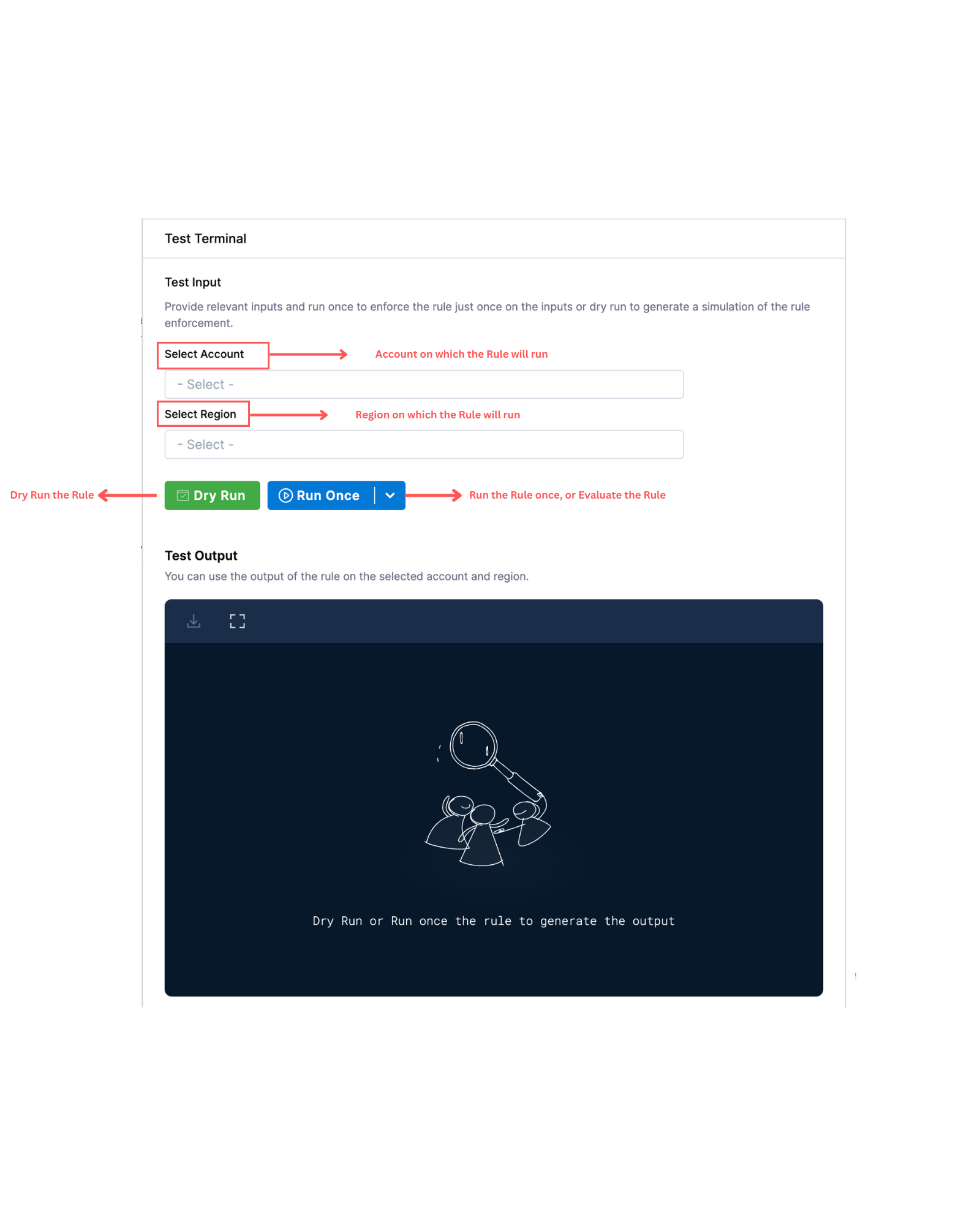 In the rule editor, a test terminal is present for users to see the output in the terminal itself upon evaluating a Rule. This is done to ensure that users can run the rules and try accordingly to check how the output would look on the selected account and region. There are two options: first, to select the target account and second, to select the regions. After providing the relevant inputs, the users can select either to dry run the rule first, run it once or enforce the rule.