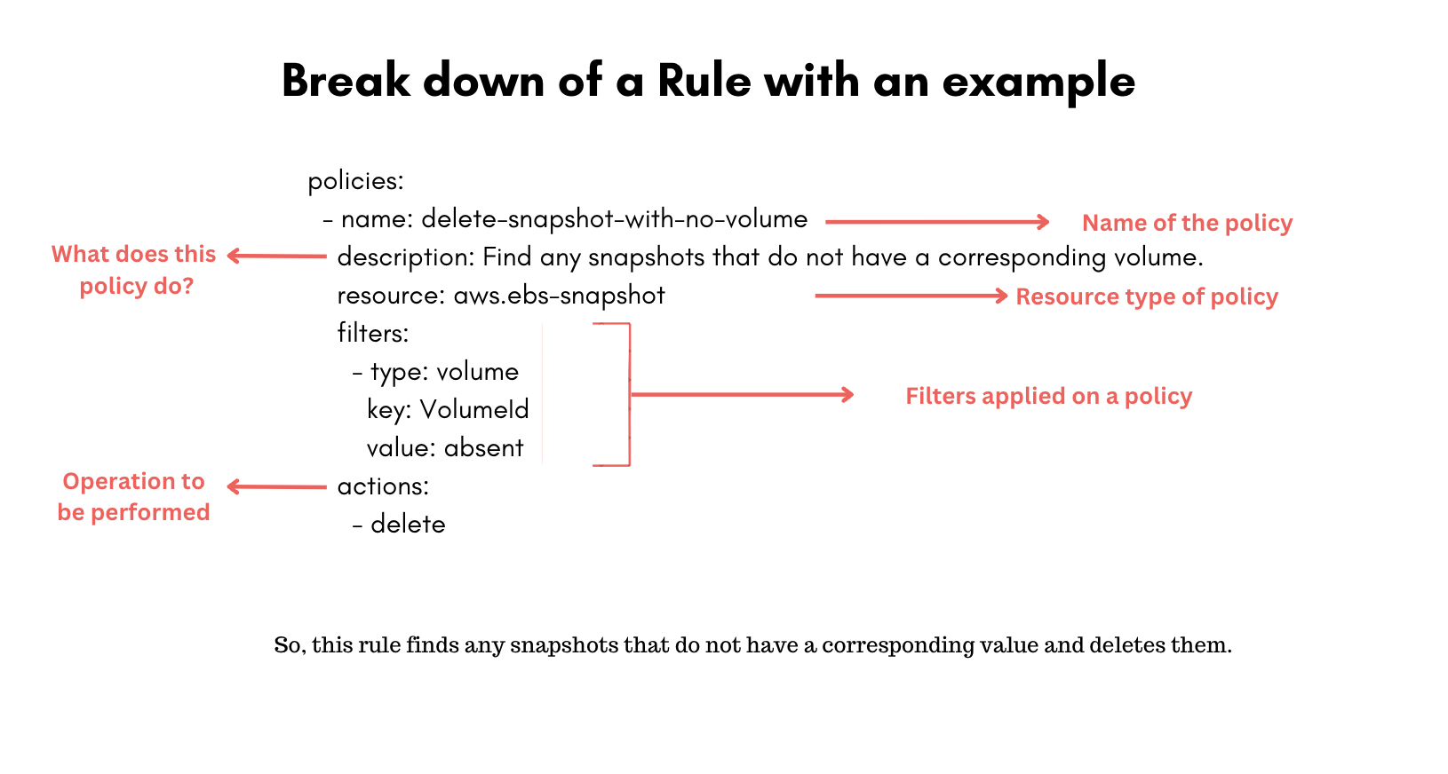 So essentially, a Rule is a file that includes logic defined by a policy that performs certain actions on the resource based on the filters provided by the user. Rules can include multiple policies, and policies include resource, filters and actions.
