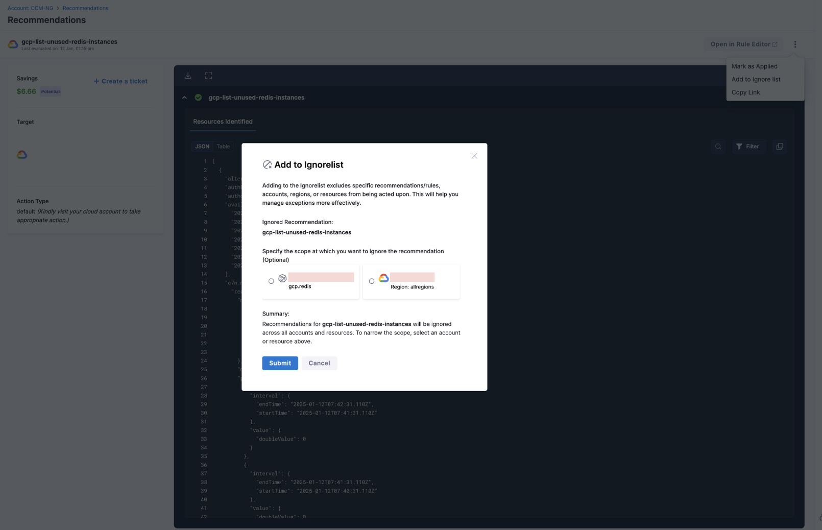 Owing to this, now, while adding a recommendation to Ignore List, users have the option to specify the scope at which the users want to ignore the recommendation. The scope can be either at: