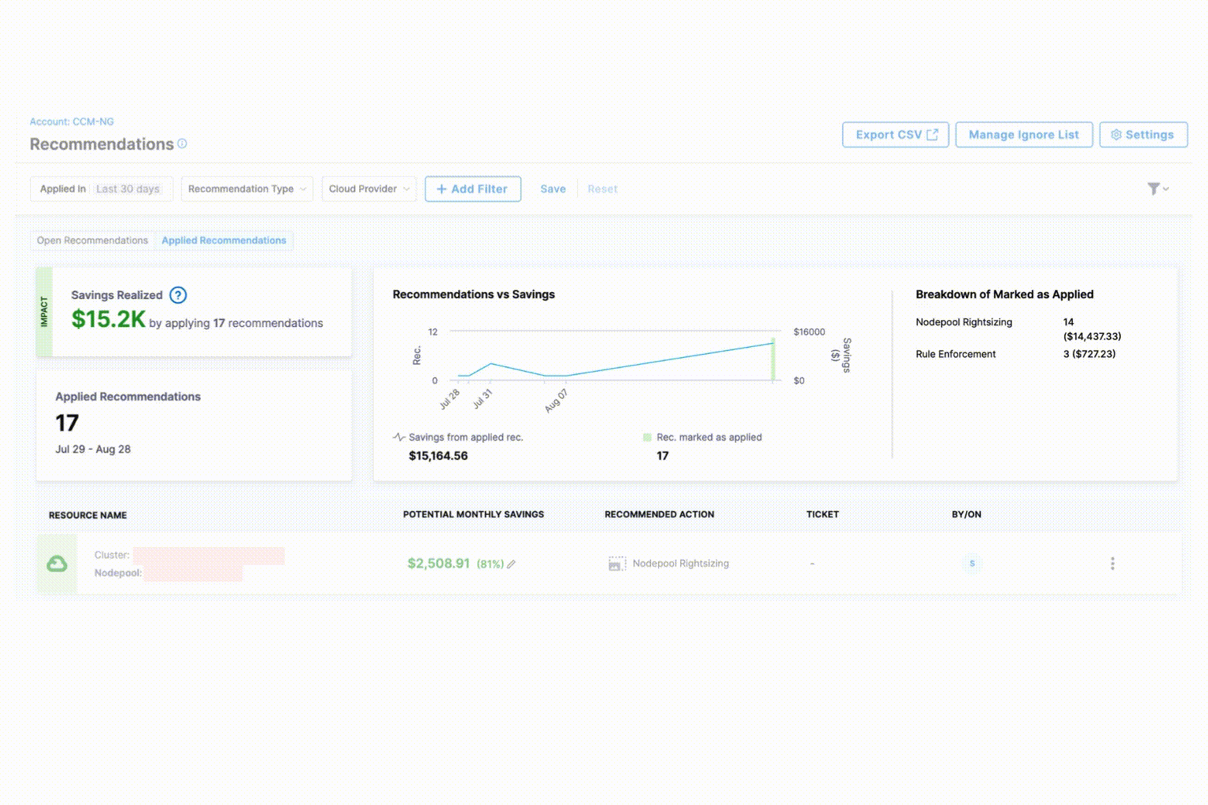 - Update Status - Mark recommendations as applied in the CCM platform once implemented. Once applied, recommendations show up in the Applied tab.