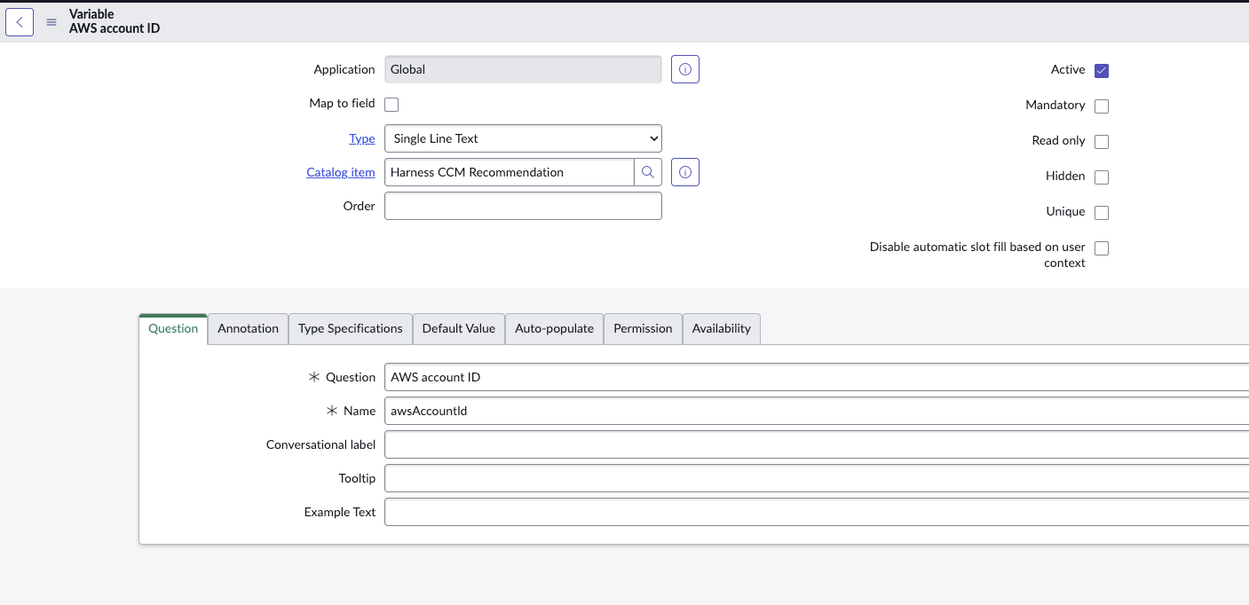 - Define a service catalog with the "Software" category. Ensure the name of the catalog item exactly matches "Harness CCM Recommendation" and mark it as Active.