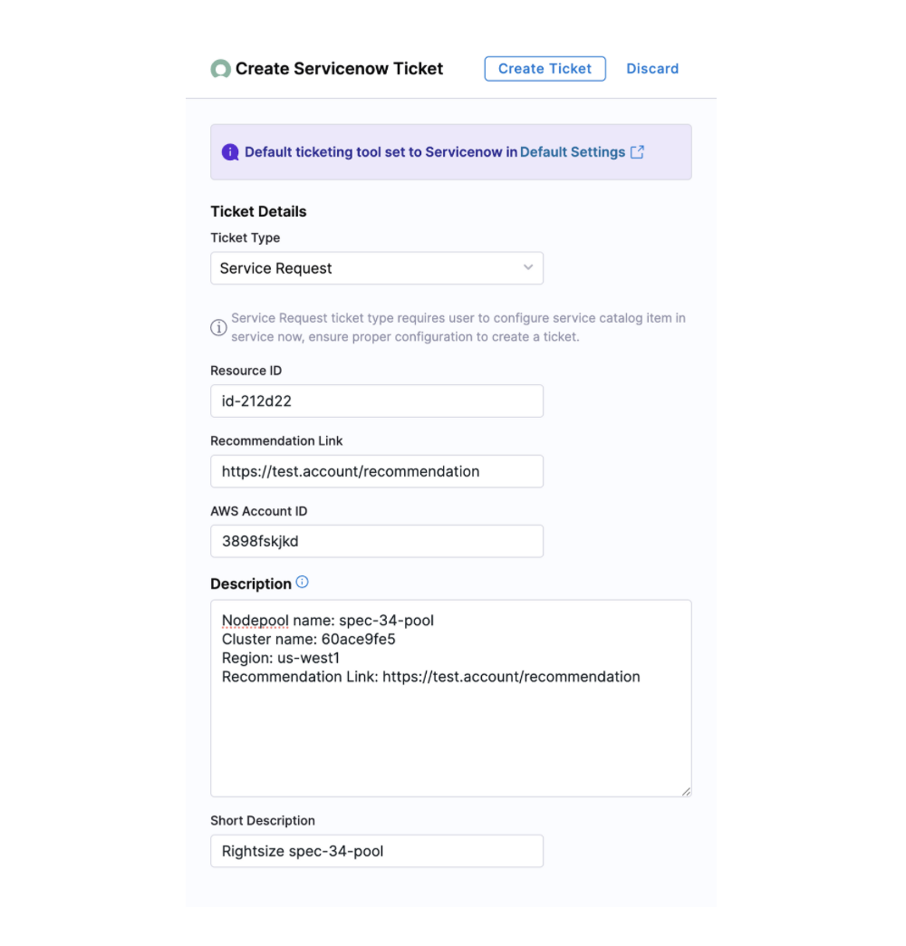 The Description field contains relevant information about the recommendation for which this ticket was created. Harness CCM retrieves the following data from ServiceNow: