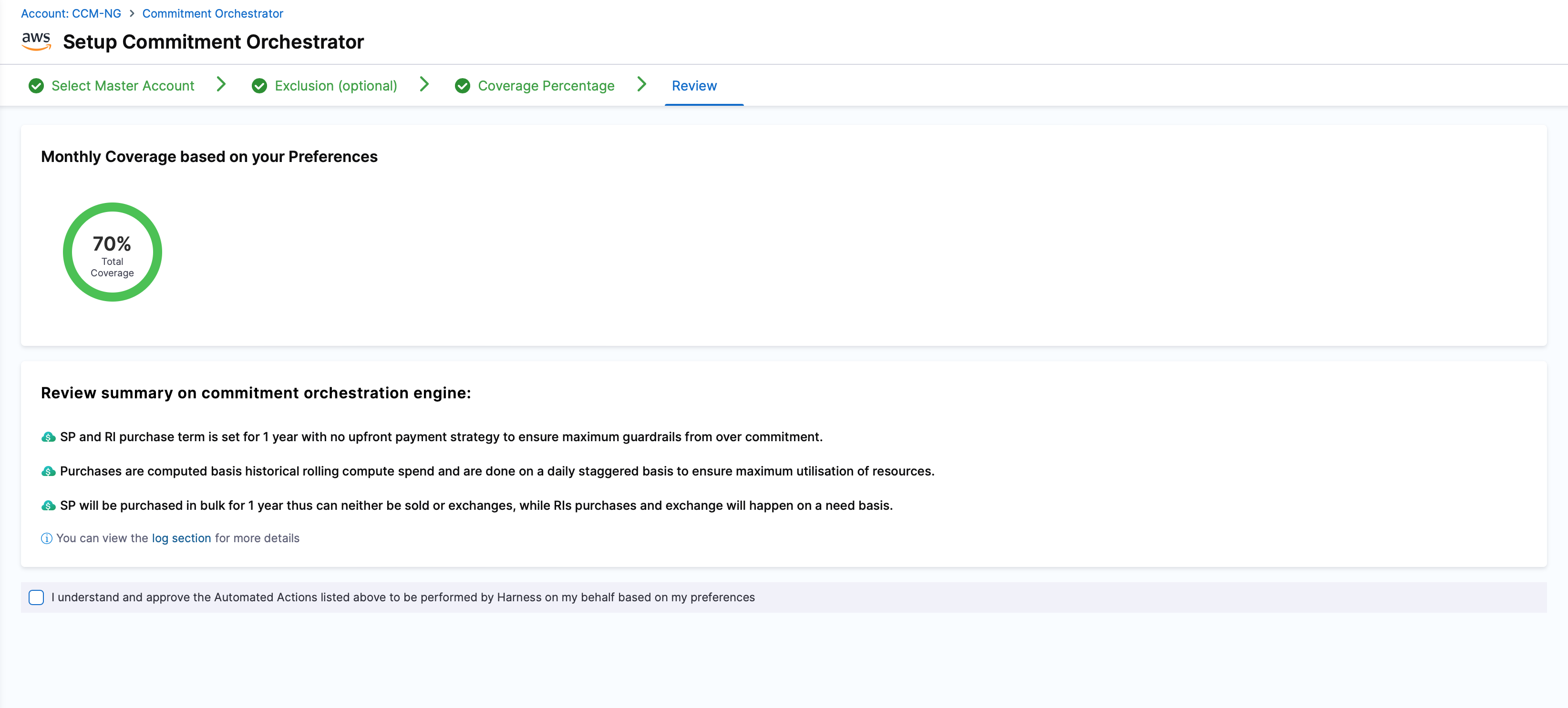 Coverage Percentage: The Coverage percentage is the percentage of your compute spend that you want to be covered by Savings Plans or Reserved Instances. The remaining amount will continue to run as on-demand.