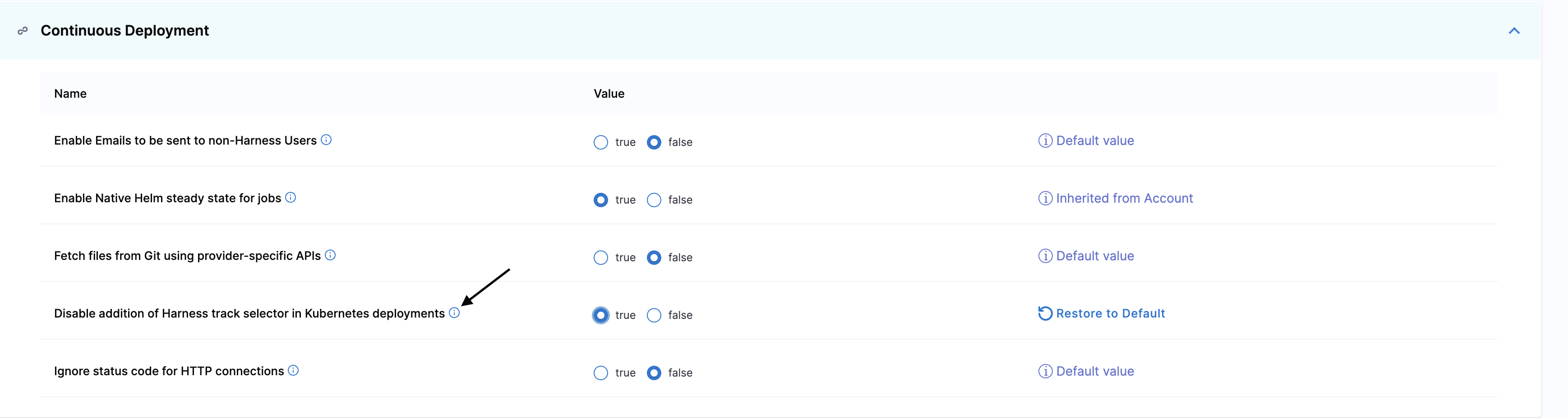 - Under Continuous Deployment, you can set Disable addition of Harness track selector in Kubernetes deployments as true.
