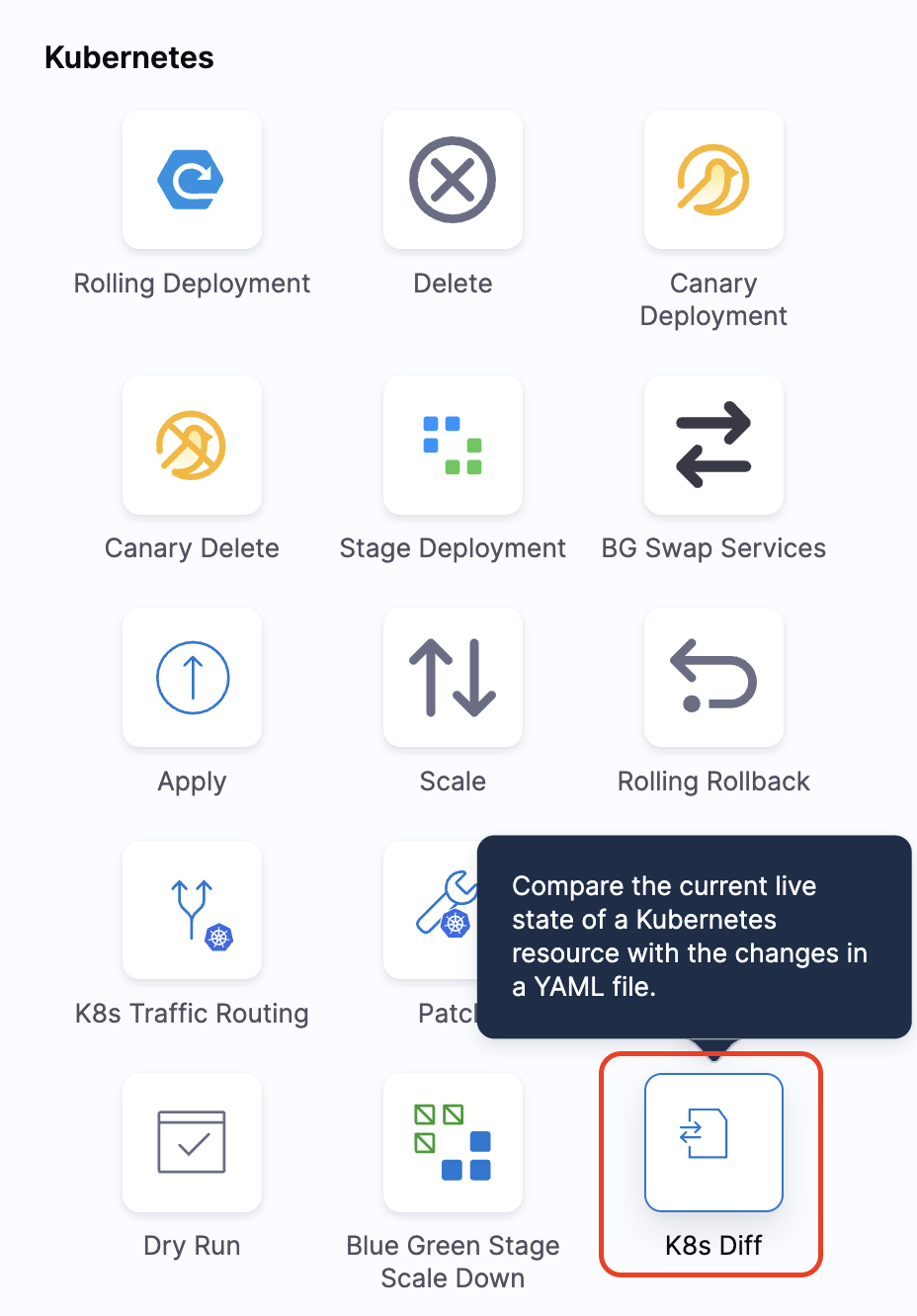 • The K8s Diff step is only available for the Kubernetes Deployment swimlane. It supports Helm chart manifests when using the K8s Deployment type, but it does not support the Native Helm deployment type.