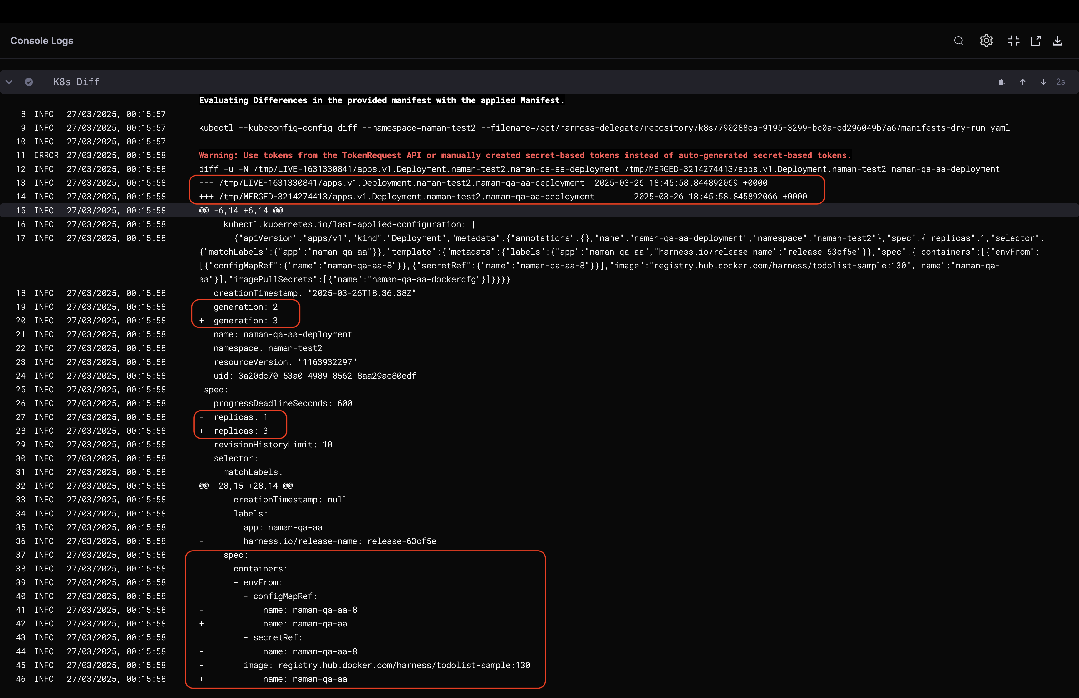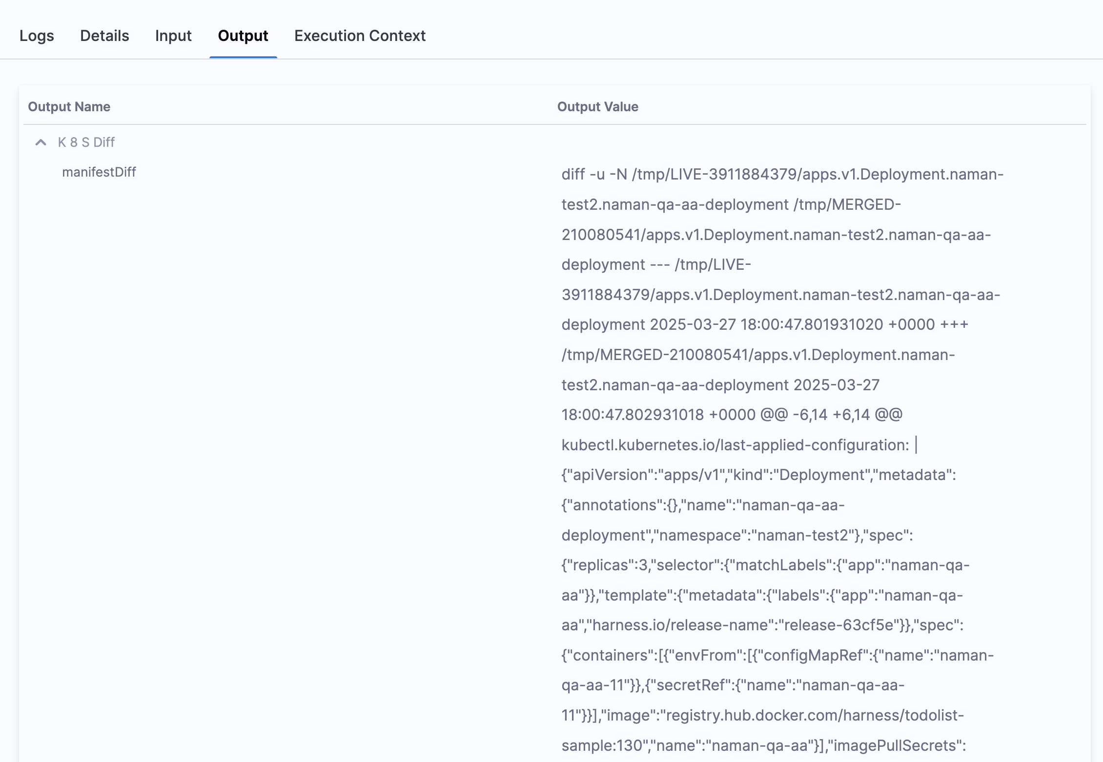This is how the execution logs would look like after executing the K8s Diff step.