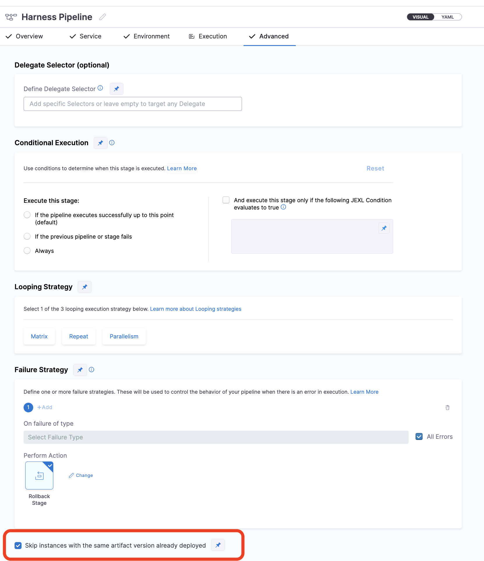 service,environment, andinfrastructuredetails, Harness will rollback the deployment to last successful pipeline with stage execution that shared the sameservice,environment, andinfrastructure.