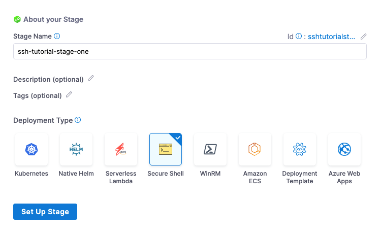 To start a SSH deployment, create a new pipeline and add a stage for Secure Shell deployments.