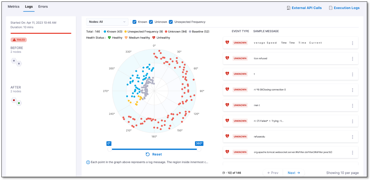 Baseline clusters encompass all the log clusters seen on the Primary or Before nodes. All the Known and Unexpected frequency clusters match one of the Baseline clusters.