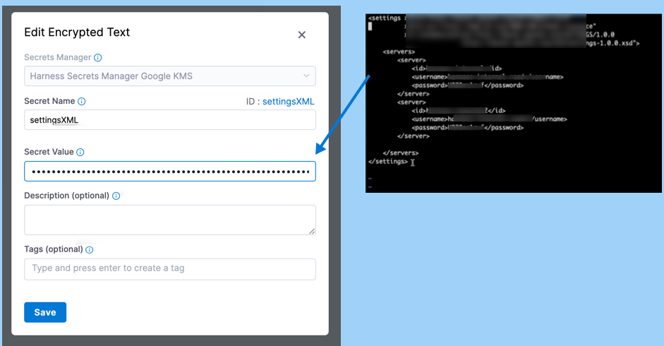4. In Secret Value, paste the XML settings content from your settings.xml file, and then select Save.