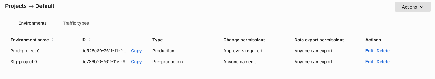 Click the View link in the Actions column to see a project's environment names and IDs.