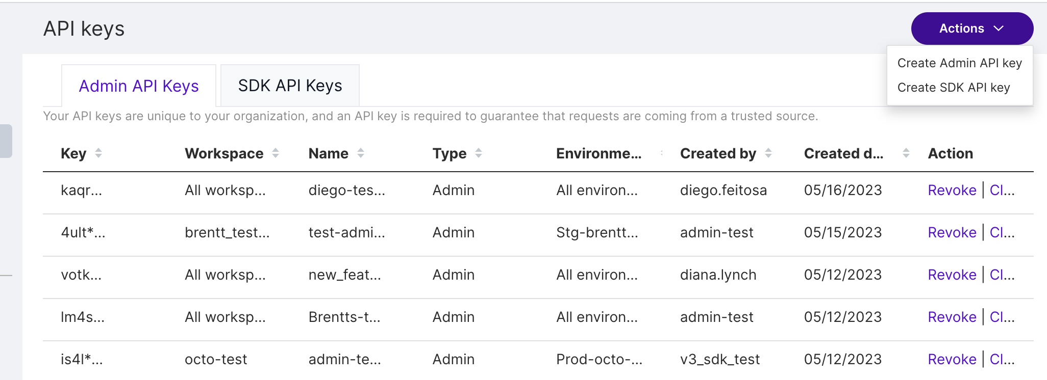 To manage your API keys, go to the API keys tab in your Admin Settings page. On this page you can: