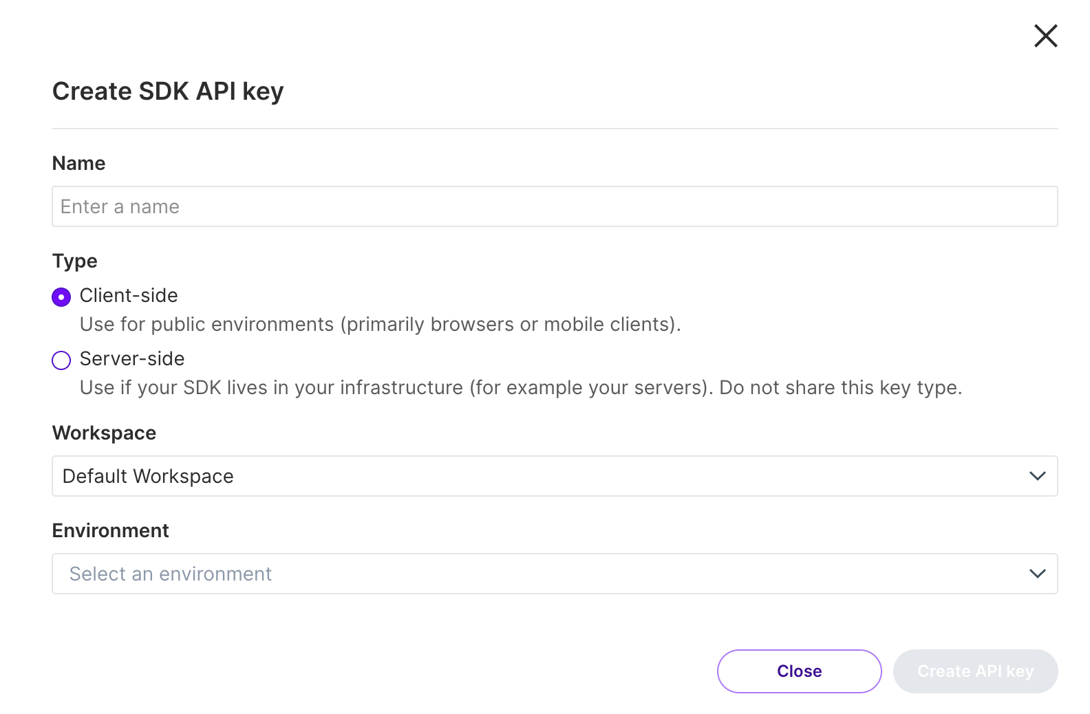 Select Server-side or Client-side as the type depending if you use this key to get treatments for a back end service or your user interface.