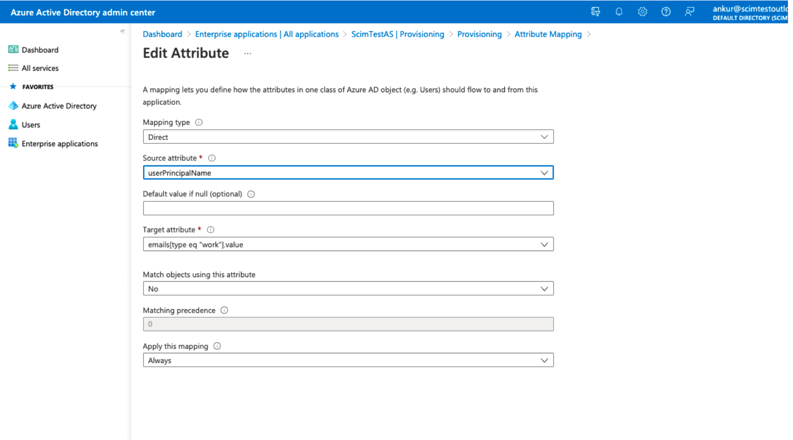 userPrincipalNameororiginalUserPrincipalName. The target attribute remains asemails[type eq “work”].value.