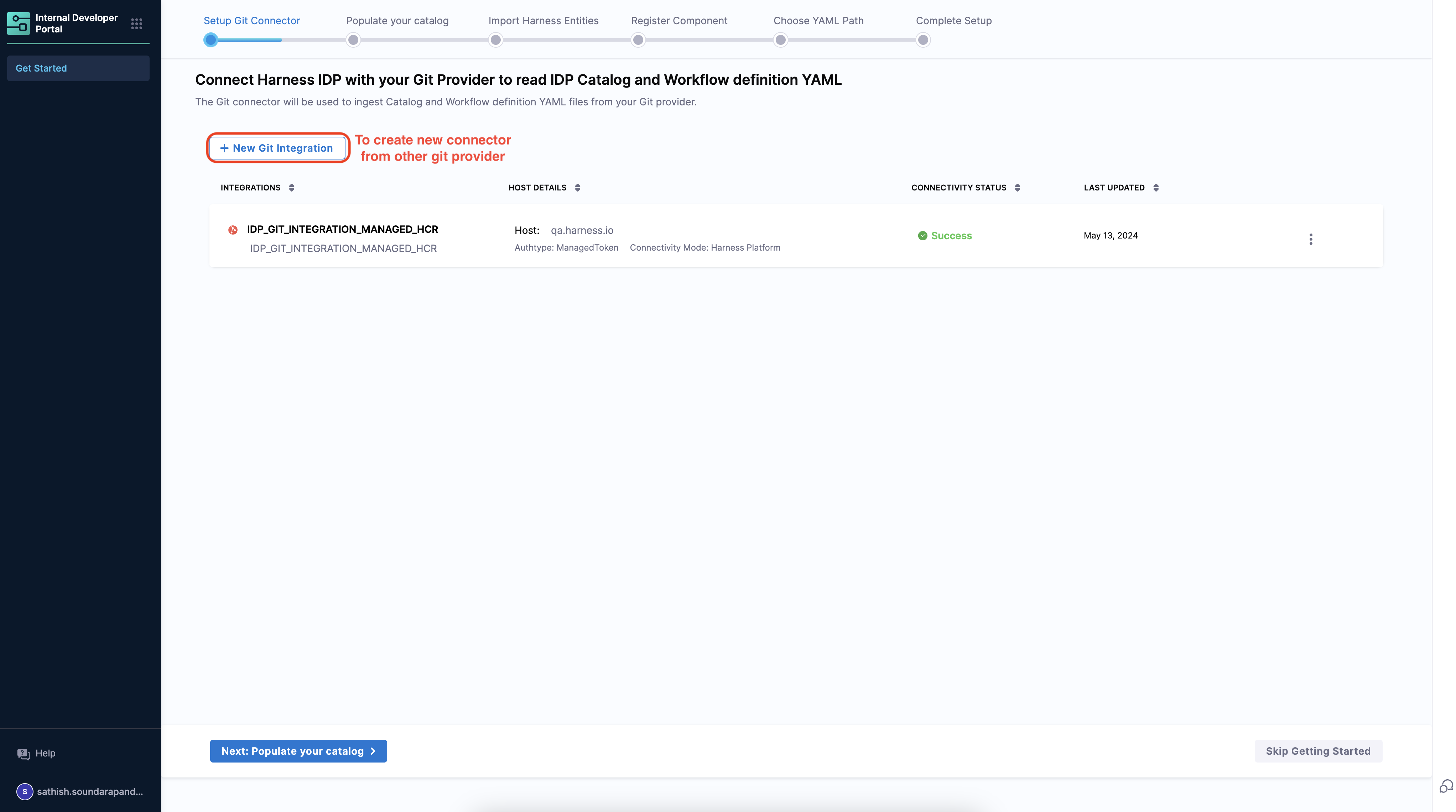 - You land on the IDP module by navigating from the sidebar after logging into your Harness account. We strongly recommend users to follow the onboarding guide selecting the Get Started, for a seamless onboarding resulting in a catalog with software components.