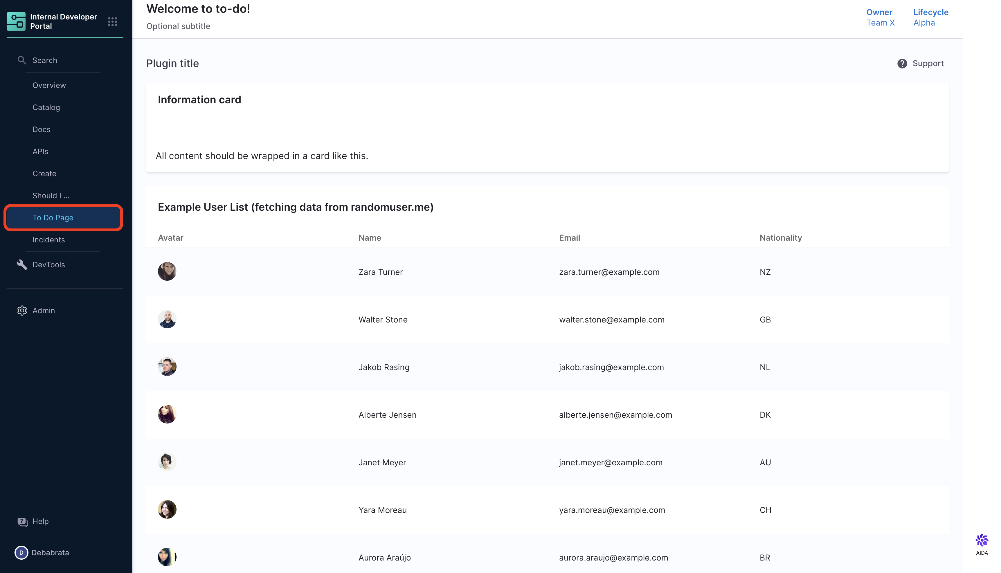 SidebarItemwith reference to your pluginto: component nameunderprops. Read more about [Configuring Layout of IDP Catalog pages](Configuring Layout of IDP Catalog pages).