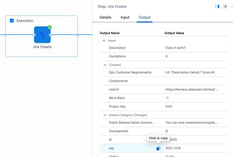 <+pipeline.stages.STAGE_ID.spec.execution.steps.STEP_ID.issue.key>with the correctSTAGE_IDandSTEP_IDvalues for the Jira Create step that creates the issue key.