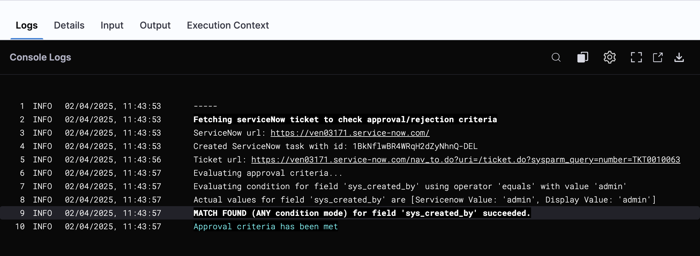 You can also view detailed logs that describe why the validation failed or succeeded in the ServiceNow approval step.