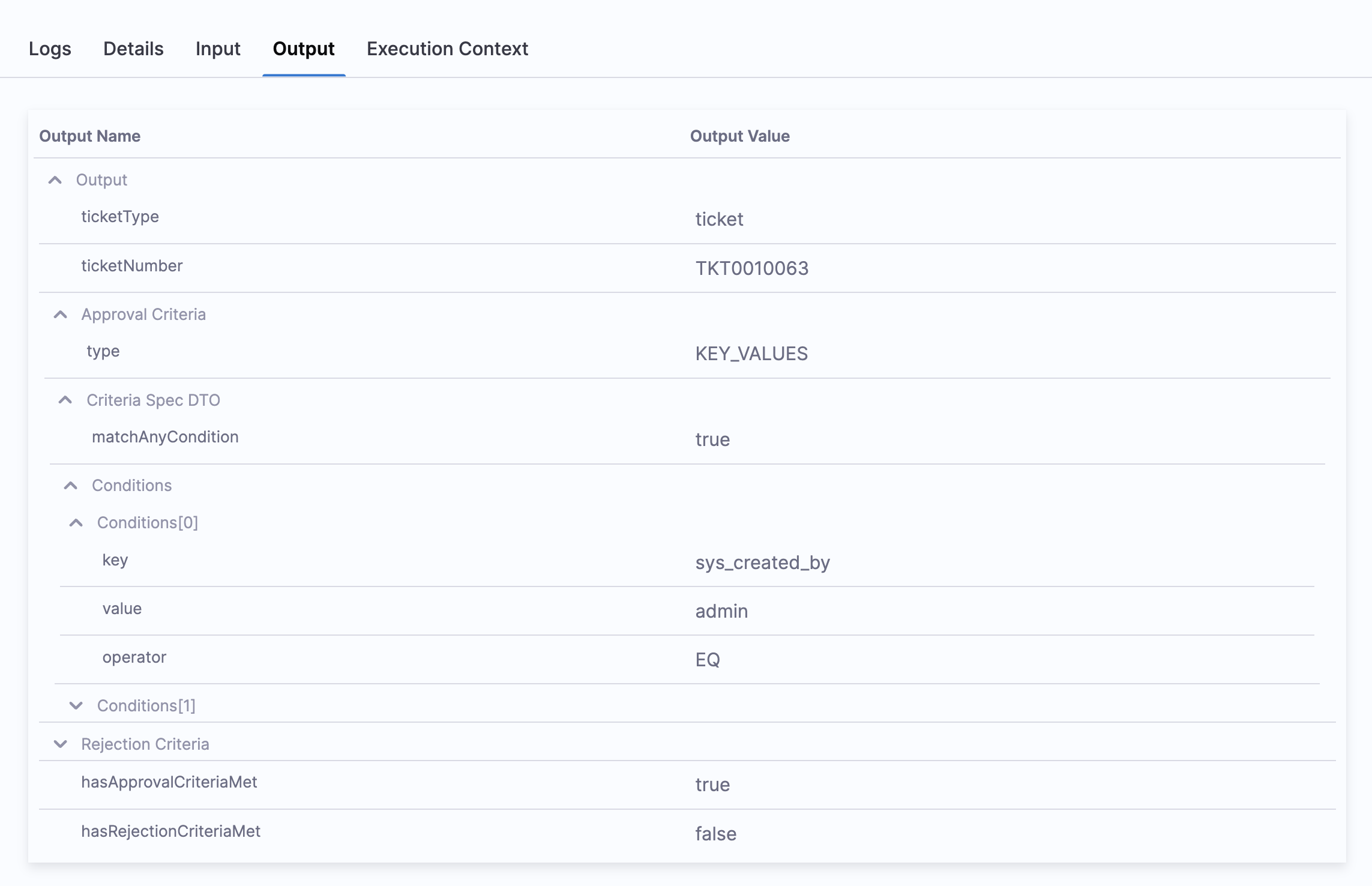 Regardless of whether the step is approved or rejected, the ServiceNow approval step will provide outputs referencing the details of the step, such as: