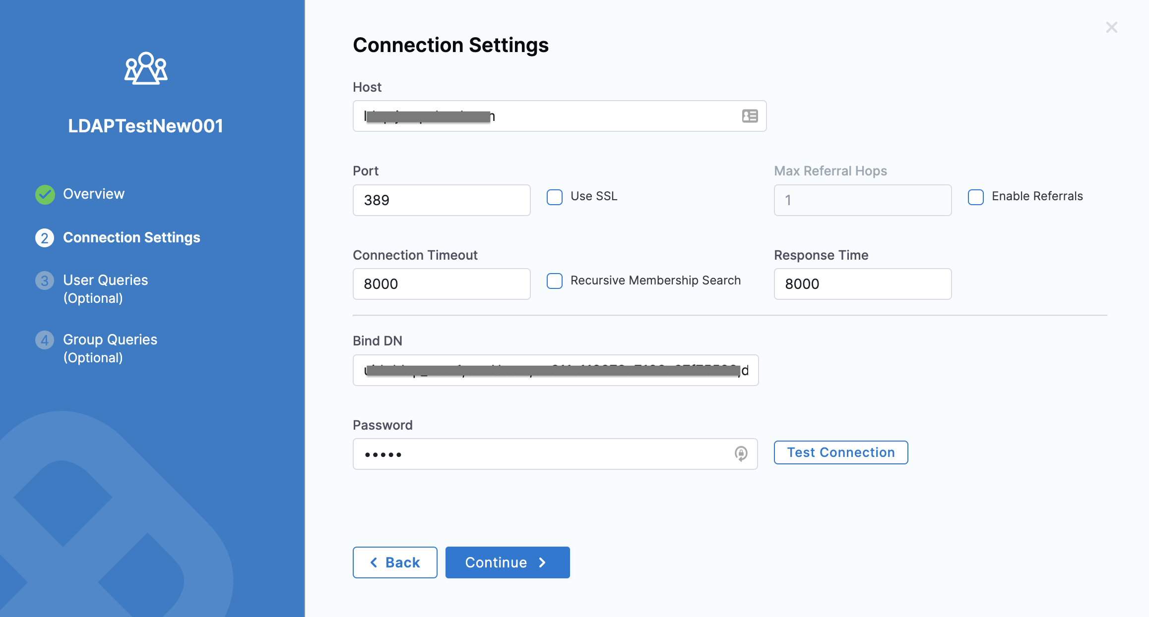 2. In Port, enter 389 for standard LDAP. If you want to connect over Secure LDAP (LDAPS), use port 636, and enable the Use SSL setting.