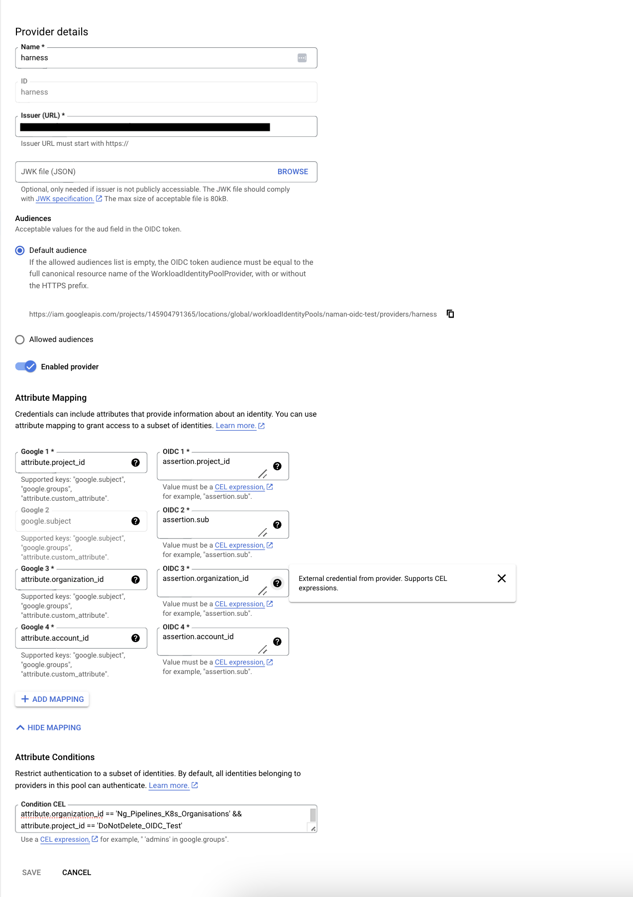 To connect to GCP with OIDC, you must configure an OIDC identity provider GCP and connect the service account with relevant permissions that Harness will use to operate in GCP. Use the following Harness OIDC provider endpoint and OIDC audience settings to create your OIDC identity provider.