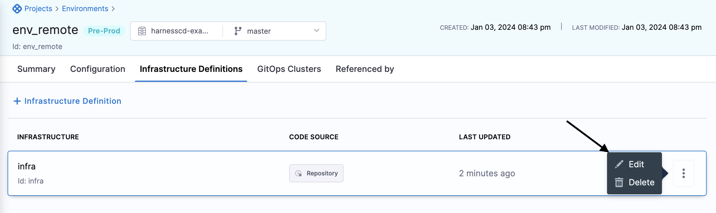 For the new infrastructure definition, select More Options (⋮) and then select Edit.