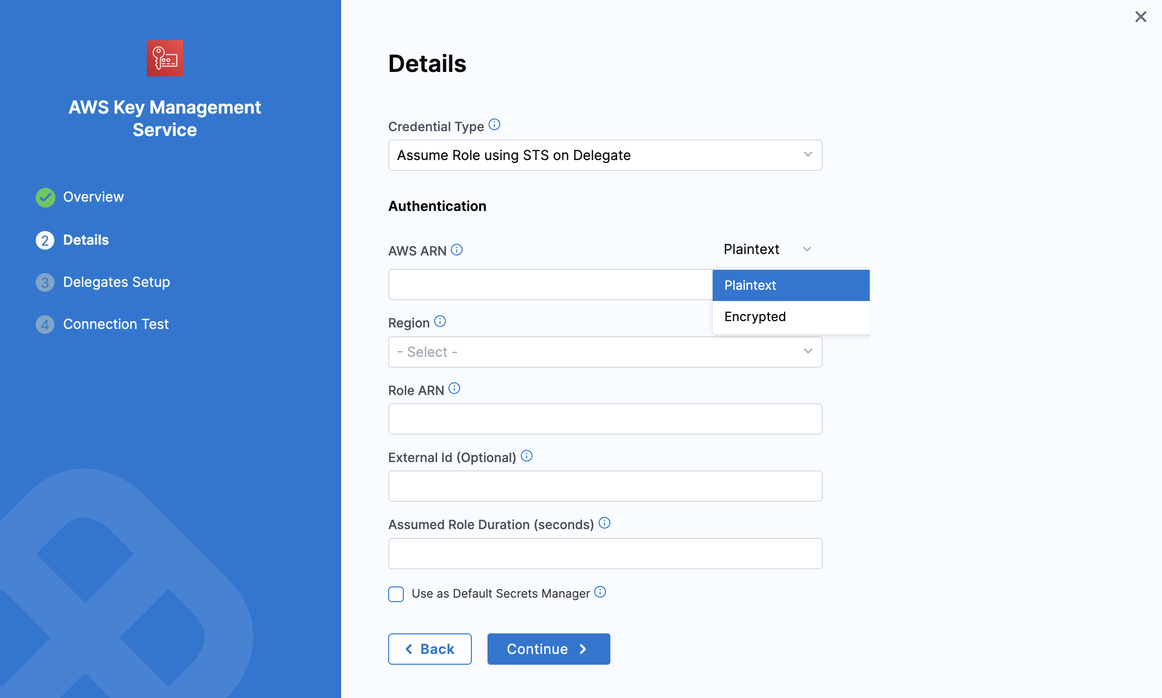 • AWS ARN: You can provide the AWS ARN as plain text or as an encrypted secret.