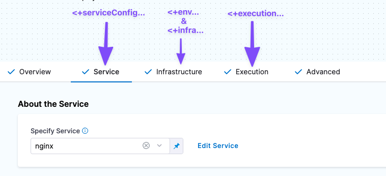 - Service expressions can be resolved only after Harness has progressed through the Service section of the pipeline. Consequently, you can use service expressions in the Infrastructure and Execution sections of the stage.
