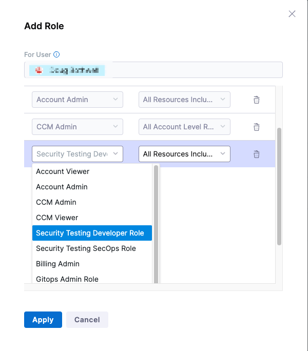 - Assign the Security Testing Developer role or the Security Testing AppSec role to the user profile.