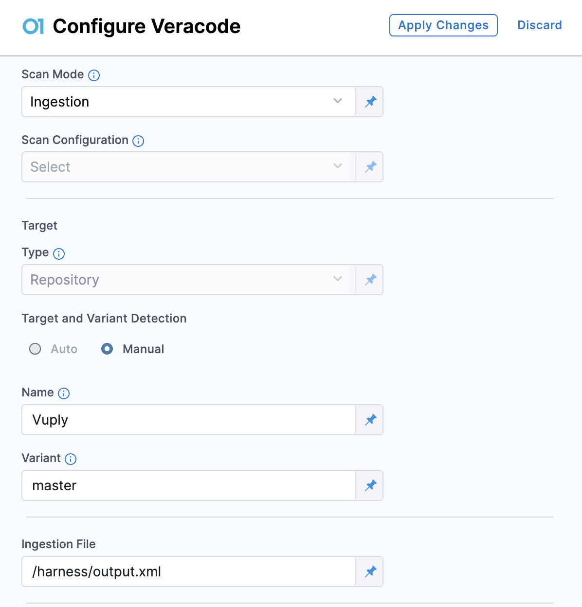 These are the essential settings required to perform an Ingestion scan using the Veracode step. The scan results, including any Veracode policy failures, can be viewed in the Vulnerabilities tab on the pipeline execution page. For additional features and configuration options, see the Veracode Step Settings section.