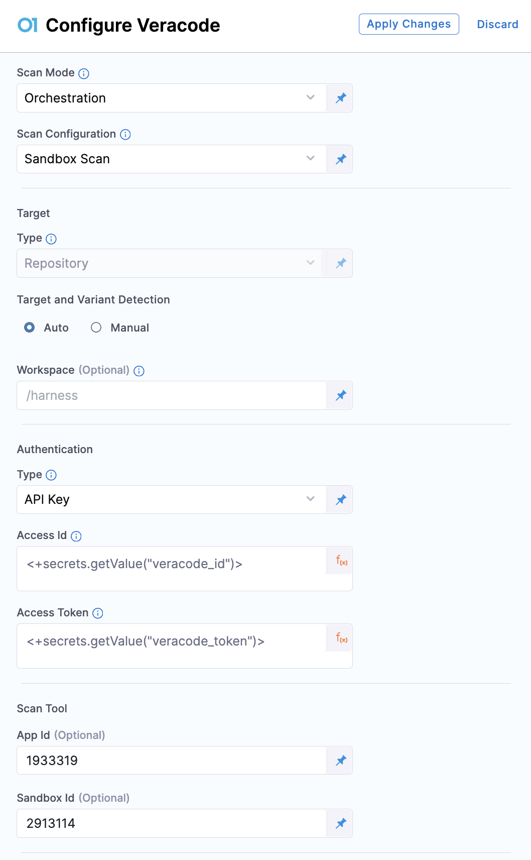 harness-HARNESS_PROJECT_ID-TARGET_NAME. Additionally, refer to this section to learn more on how to use an existing Veracode Application created by STO. - Sandbox Id(optional): This field appears if you select Sandbox Scan as your Scan Configuration. You can enter your Sandbox Id to use an existing Veracode Sandbox. If left blank, STO will create a new Sandbox automatically, naming it in the format