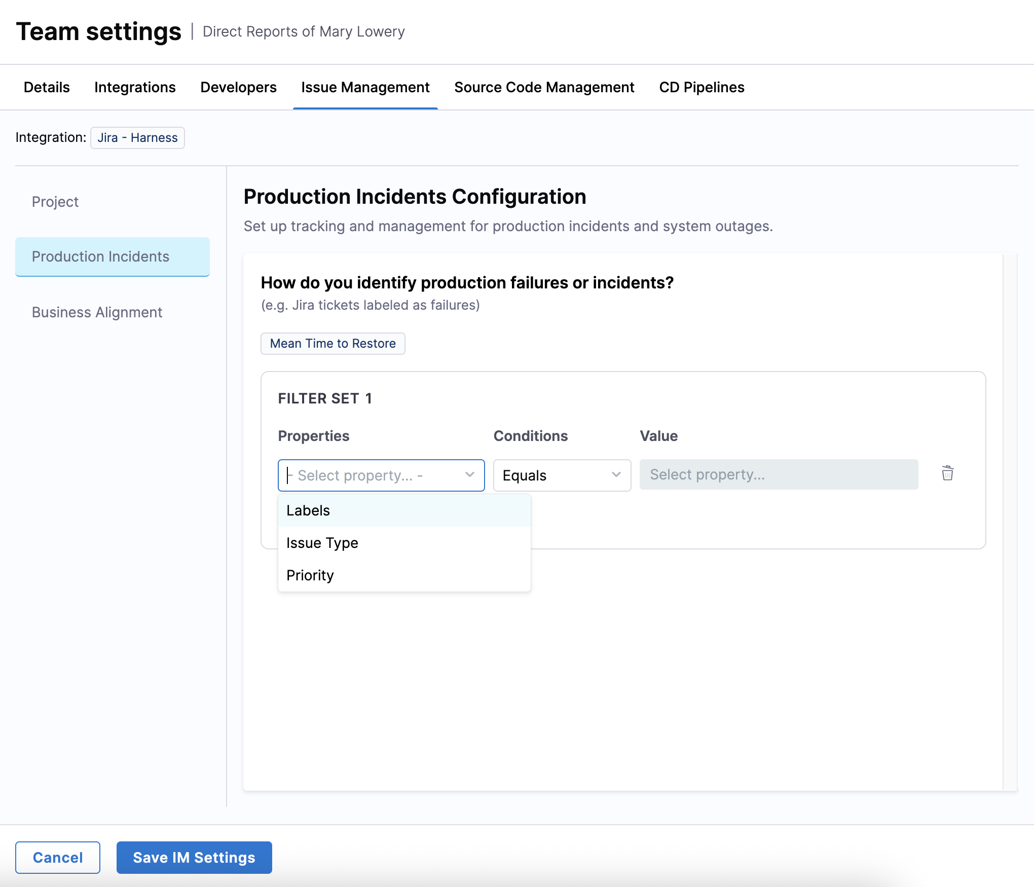 Create a filter set by adding conditions to define criteria for your team's issue management system on the Projects tab.