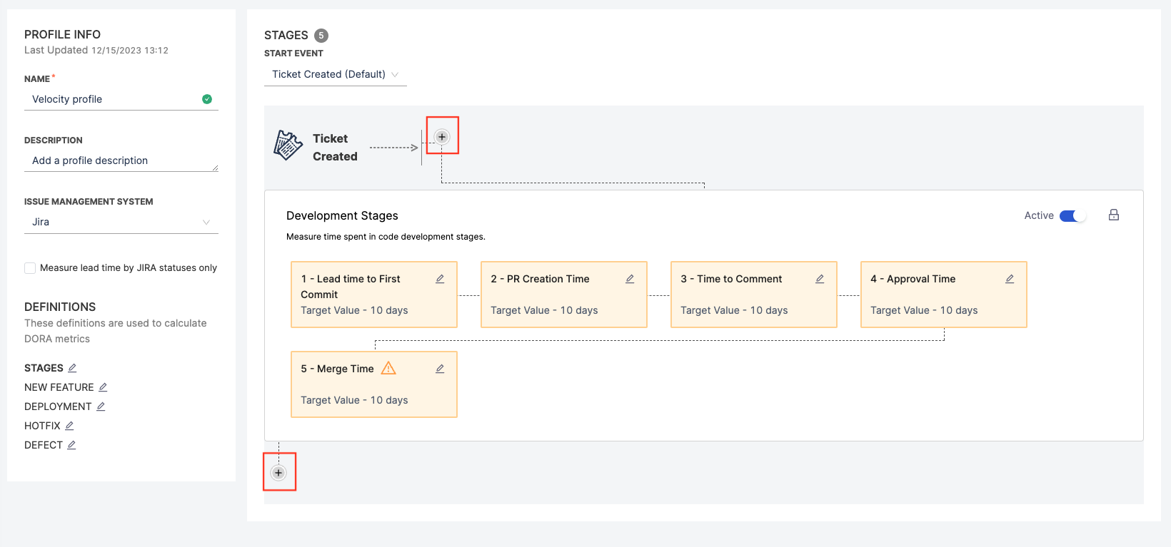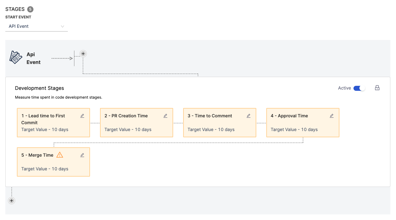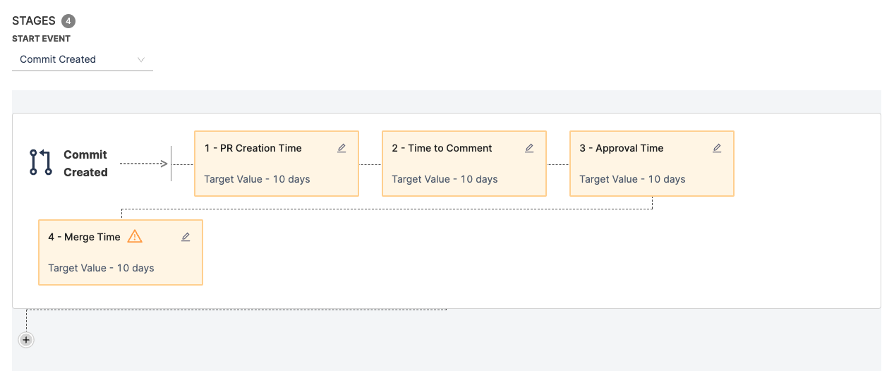 5. Review the pre populated Stages that represent the PR lifecycle, from PR creation to merge. You can edit, add, and remove stages as needed. You can edit the data or fields that drive each stage, set time range goals, and more.