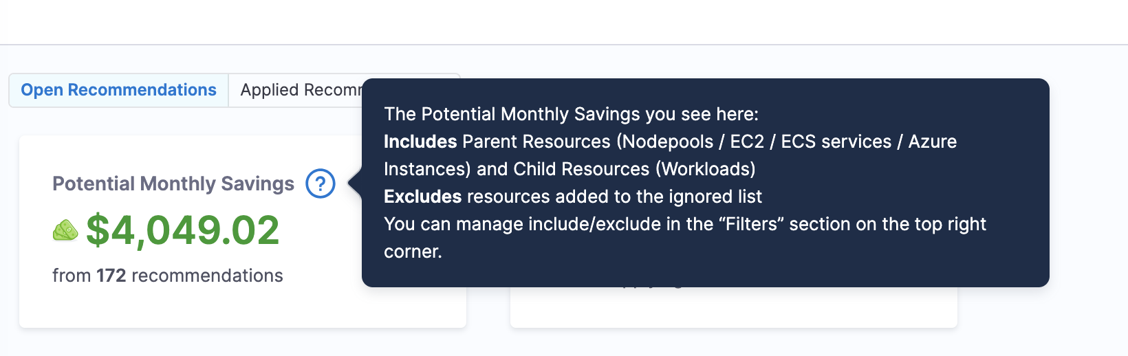 - Overridden Savings: Savings amount that has been manually adjusted for applied recommendations