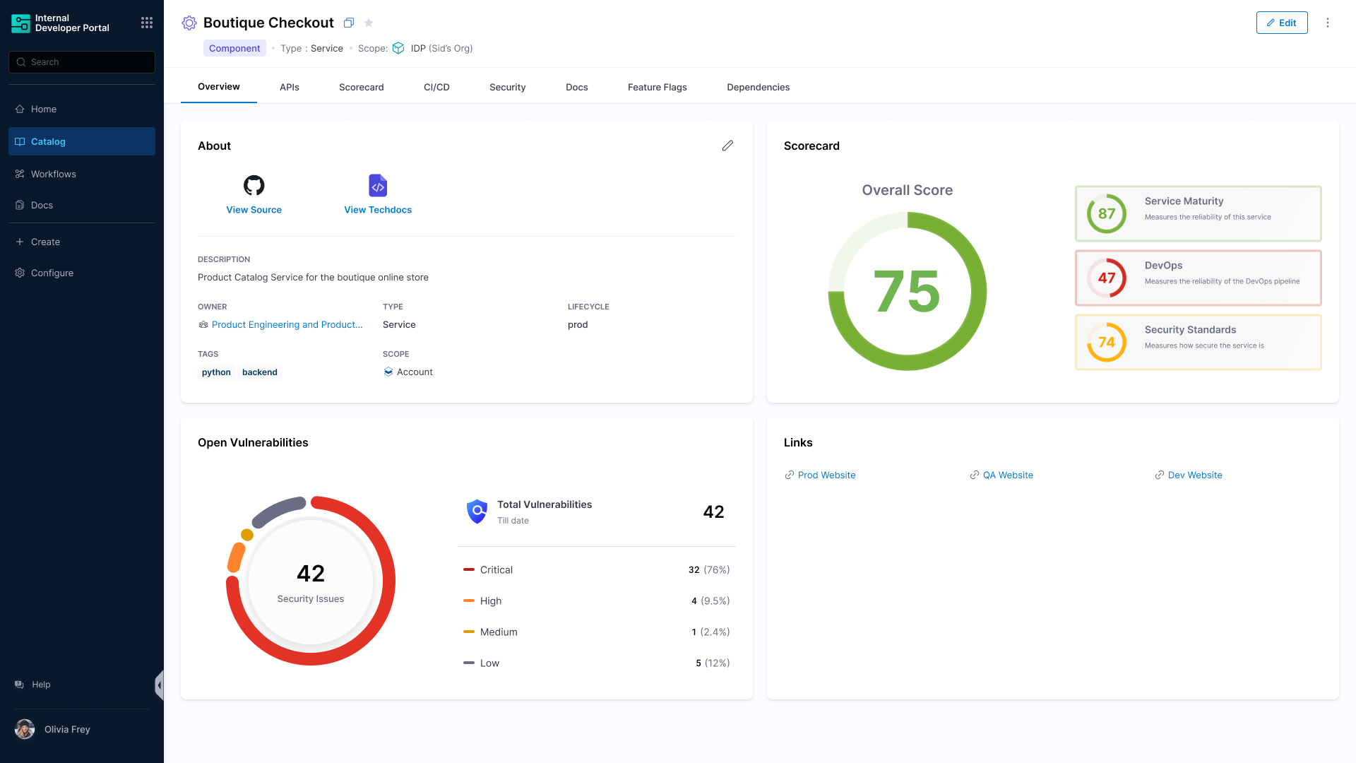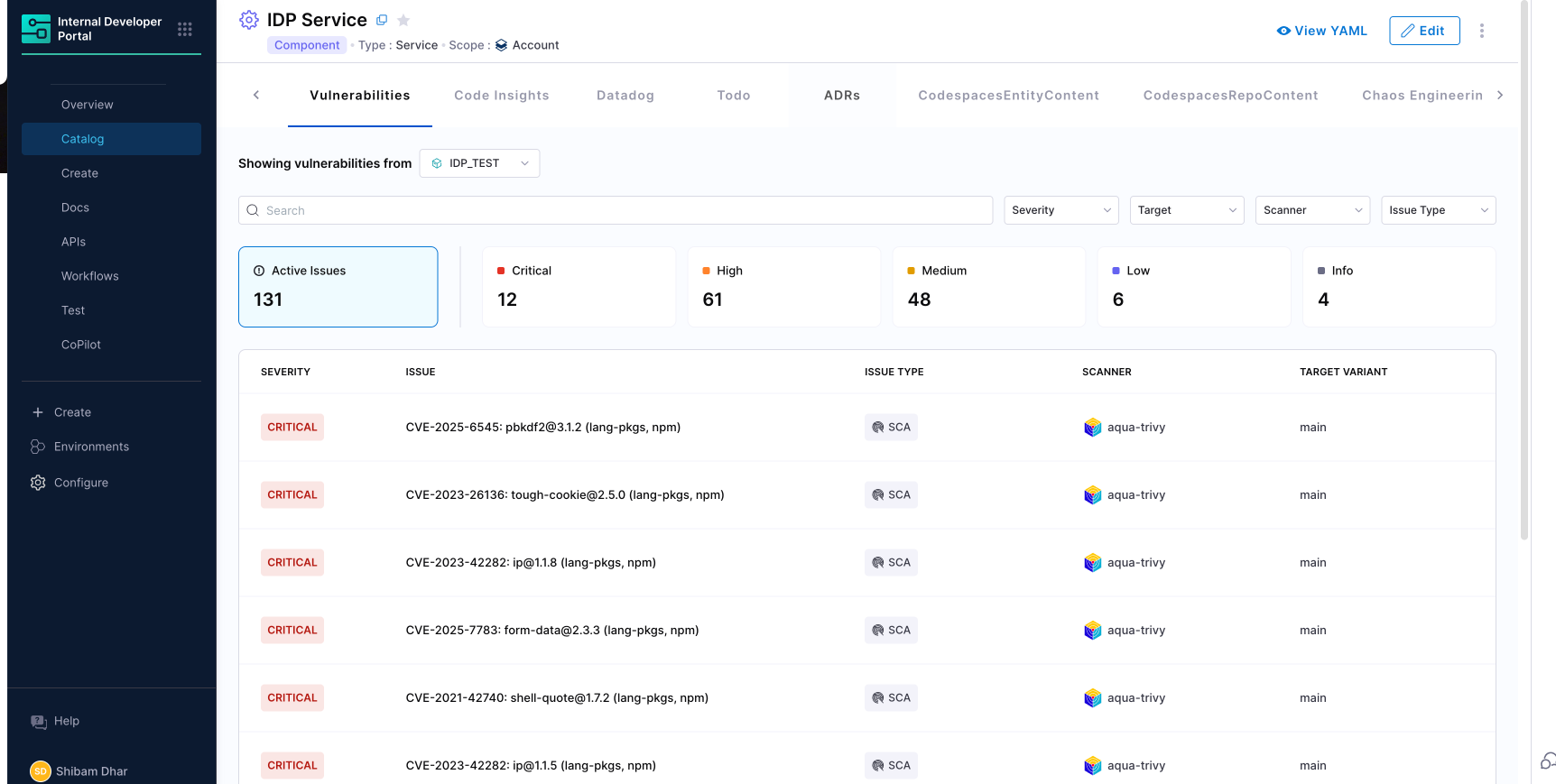 Harness Internal Developer Portal (IDP) now integrates with Harness Security Testing Orchestration (STO) to surface real-time vulnerability data directly inside the Software Catalog. Vulnerabilities such as CVEs from static and dynamic scans are displayed alongside services, projects, and components, minimizing context switching and enabling faster triage.